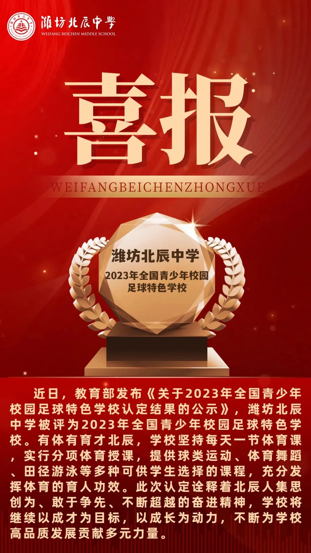 教育部最新公示|潍坊北辰中学被认定为2023年全国青少年校园足球特色学校